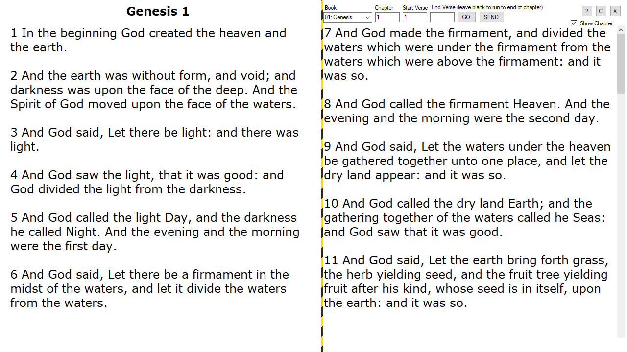 To start the program open the exe file. You will then need to select the source passage of scripture using the boxes at the top right and load it into the preview pane by clicking the [GO] button. Formatting changes can then be made in the preview pane. To send these across to the display pane click the [SEND] button. This will send the top lines in the preview pane to the display pane, not the visible ones.